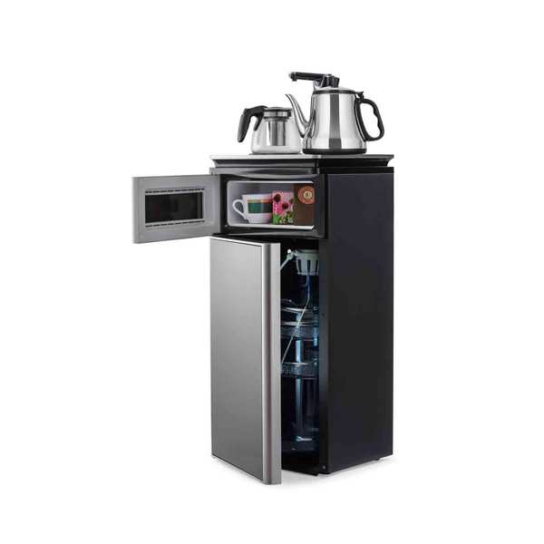 Оригинальное исполнение кулера с нижней загрузкой бутыли состоит из заварочного и электрического чайников, сенсорной панели управления, удобного крана подачи воды и шкафчика для хранения. Яркая световая индикация и информативный дисплей на сенсорной панели сообщат о текущем температурном режиме и подключении к сети. Встроена защитная система от случайного нажатия и система подогрева заварного чайника, которая позволяет поддерживать температуру до 24 часов.