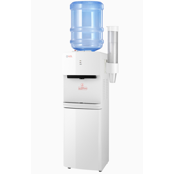 Новинка в ассортименте АЕЛ - напольный кулер с верхней загрузкой бутыли с компрессорным охлаждением яркого белого цвета с черными вставками. Высота кулера 930мм позволяет комфортно нажимать на три клавиши, одна из которых - горячей воды имеет защиту от случайного нажатия.