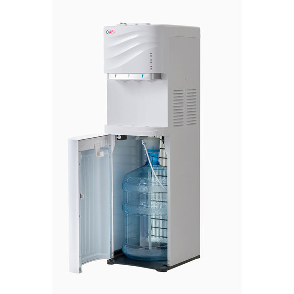 Новый кулер с нижней загрузкой бутыли белого цвета. После снятия крышки с бутыли Вам не надо поднимать её наверх. Просто установите трубку забора воды на бутыль и задвиньте внутрь шкафчика кулера. Оригинальный дизайн кулера с волной на лицевой панели выделяет этот кулер из всех аналогичных по техническим характеристикам. Снабжен 3-мя краниками-клавишами (горячая/прохладная/холодная).