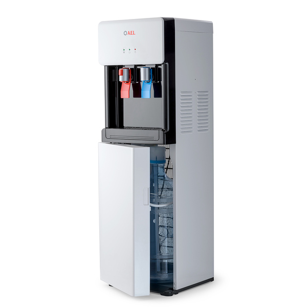 Компрессорный кулер с удобной нижней загрузкой бутыли. Основные части кулера выполнены из пластика, а боковые стенки из металла, что позволяет прикрепить держатель для стаканов на магните. На боковых стенках имеются технические отверстия и для крепления держателей на шурупах. Длинные удобные PUSH-краны с защитой от случайного нажатия на горячем кране. Широкий лоток для сбора капель.